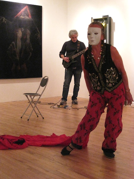 To some evocative noodling by guitarist Sean Carolan (electrified by a legendary Pignose travel amp I immediately coveted) Vernita wordlessly prowled the space with a white mask and initially, her plastic wine cup. She fondled some red clothing and embraced a mummy-like mannequin swaddled in red. She ended up in a small wooden room in the corner that was spattered with blood and hung with chains on the inside. I was too busy snapping away to construct a mental narrative about what was going on, and my beau sat on the edge of his chair, looking like he wanted to vacate it any minute.